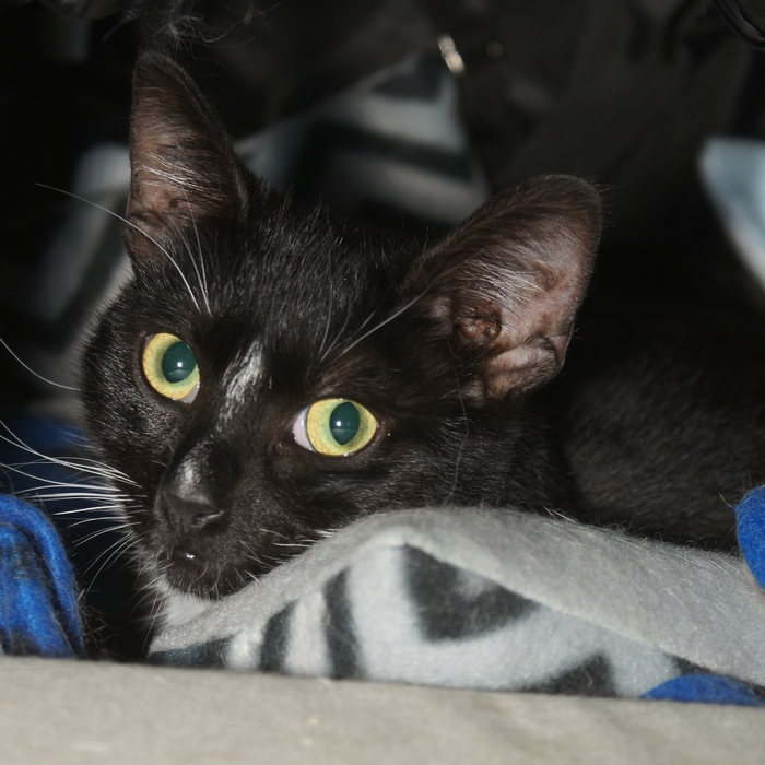 Die kleine schwarze Miez kam im Austausch für Bob. Alina hatte in der Quarantäne 6 Tage nur hinter der Toilette versteckt gesessen und war sehr scheu. Die ersten Tag habe ich sie kaum gesehen und sie lebte lange im Bettkasten von meinem Schlafsofa. Dann traute sie sich immer öfter raus.